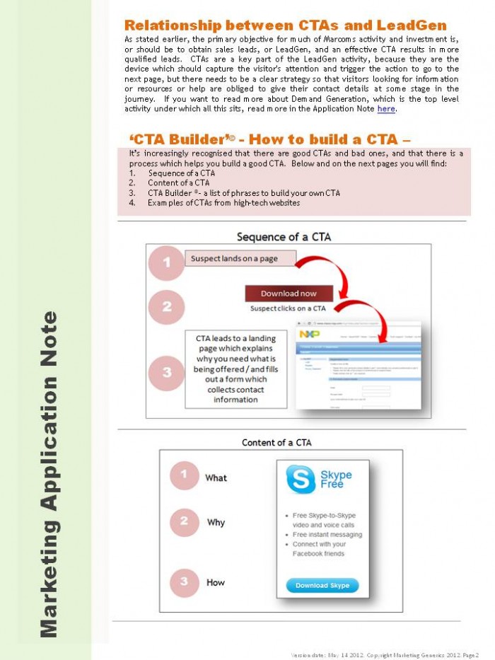 Increasing pressure on Demand Generation and particularly Lead Generation (LeadGen) is in turn requiring marketers to extract maximum response out of their Marcoms activities, and in particular to create dynamic call-to actions (CTAs) which will drive their potential customers (or visitors if on a website) to the next stage in the Sales Funnel. This Application Note explores how companies in the high-tech space are using CTAs on the web, and explains CTA Builder© - a short but simple system which enable Marcoms to build their CTAs.